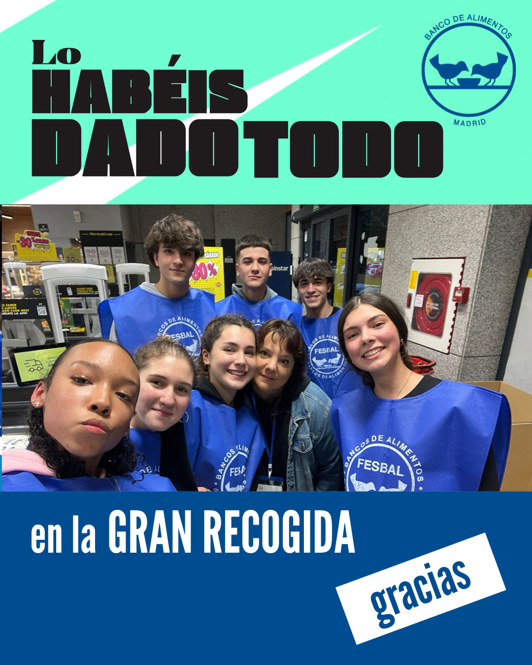 - El Banco de Alimentos de Madrid da las gracias a todas las personas voluntarias, donantes, organizaciones, centros educativos, medios de comunicación y a las propias cadenas su colaboración en esta campaña gracias a la cual se han repuesto stock en nuestros almacenes y podremos seguir dando seguridad alimentaria, garantizando una comida diaria, a más de 100.000 personas vulnerables a través de cerca de 500 entidades benéficas colaboradoras. Recordemos 1 de cada 6 personas vive en riesgo de pobreza o exclusión social en nuestra Comunidad.